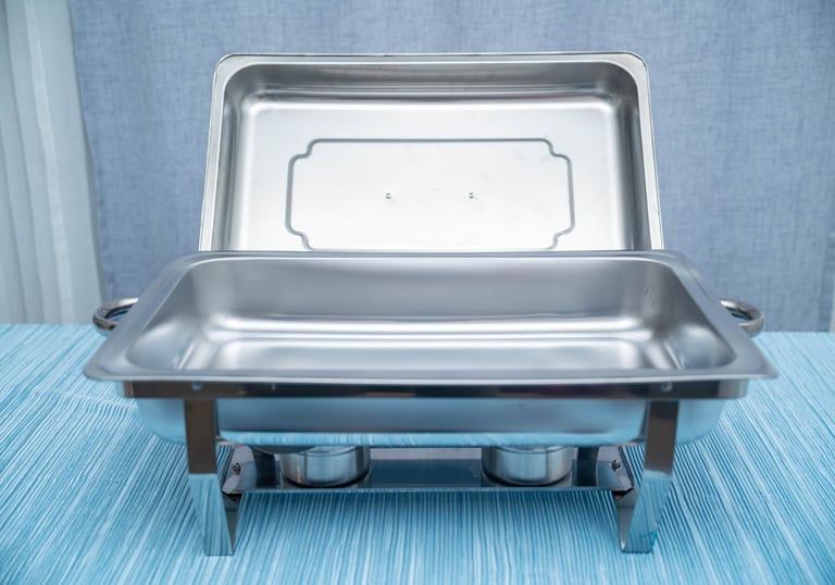 Location de couverts, nappes, assiettes et chauffe-plats buffet.